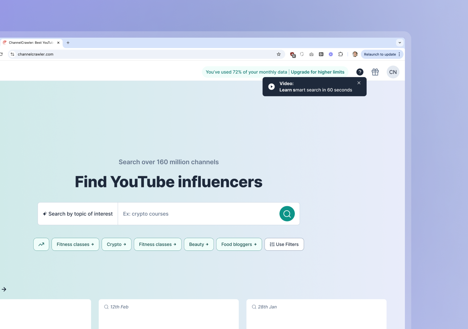 End-to-end platform for brands & influencer marketers; AI smart search, channel metrics, data enrichment, email credits, live data on top & trending channels & more